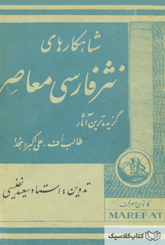 گزیده ترین آثار طالب اف – علی اکبر دهخدا – محمد مسعود – جهانگیر جلیلی – علی دشتی – بزرگ علوی به ضمیمه مقدمه جامع و تاریخچه میسوطی از تحول و تکامل نثر فارسی از آغاز تا کنون و تعریف سبکهای ادبی به روش اروپایی و تقسیمات آن و تطبیق آن با ادبیات ایران .