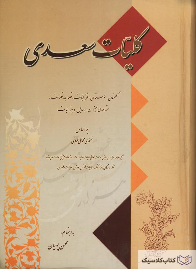 نسخه کامل کلیات سعدی بر اساس نسخه محمد علی فروغی که دارای کشف الابیات و واژه نامه واژگان دشوار و معنی احادیث و آیات و فهارس کامل و مشروح است که واجد بخش هزلیات و خبیثات نیز هست .