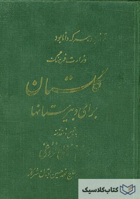 گلستان سعدی با تصحیح محمد علی فروغی که مزین است به نقاشی های رنگی محمد تجویدی برای تدریس در دبیرستاتها